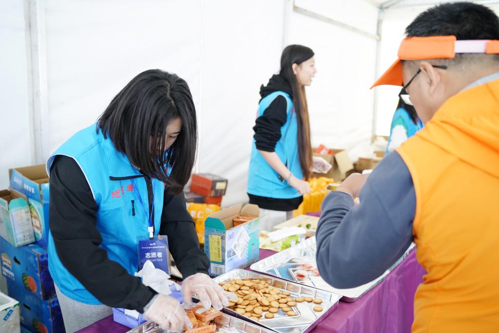 在主会场区域,志愿者们完成了近千份完赛物资的装袋、整理工作并在各工作岗位上机动服务。选手完赛,志愿者们送上一句句“恭喜完赛”为选手们点赞,同时,高效快捷地将完赛包递到选手手中,及时递上补给品。志愿者们细致专业的服务获得了参赛选手的一致好评。