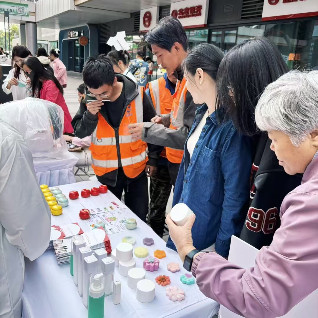 管理系精心策划了一系列趣味与实用兼具的活动。在化妆品科普宣传区,师生们向居民发放护肤知识宣传手册,帮助大家避开选购雷区。AI皮肤检测活动,凭借先进设备和专业解读,让居民深入了解自身皮肤状况,收获众多好评。新中式盘发体验区,老师现场展示并指导居民打造精致盘发,让传统美学在现代社区中焕发生机。闻香小游戏则别具一格,居民通过闻不同护手霜的香味猜出名称,猜对即可获赠护手霜,现场充满欢声笑语,拉近了邻里间的距离。