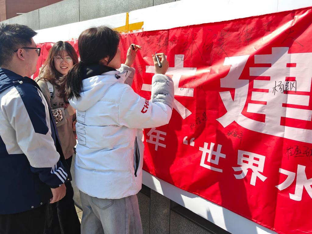 活动现场,志愿者们通过现场讲解、发放宣传手册等方式,向师生们介绍了“世界水日”与“中国水周”的相关知识。学习节水知识后,师生们郑重有序地在“节水师生共建·共谱世纪画卷”主题条幅上签名,从认知走向行动,传递着对绿色生活方式的认同与践行。
