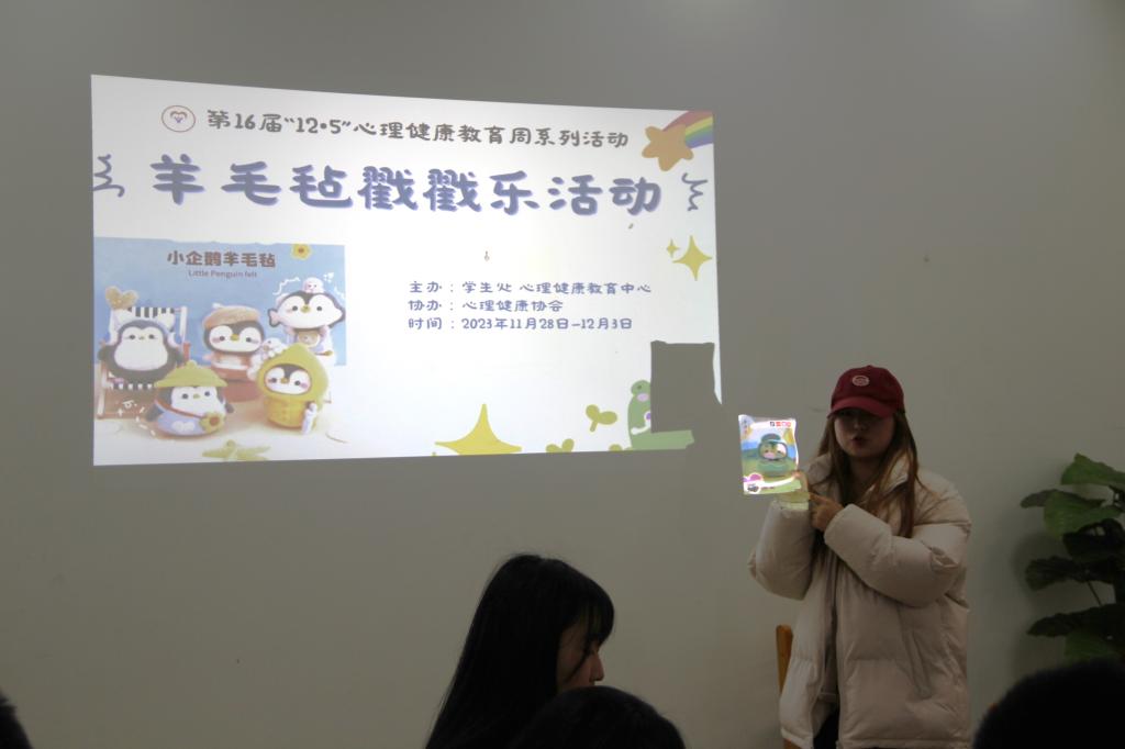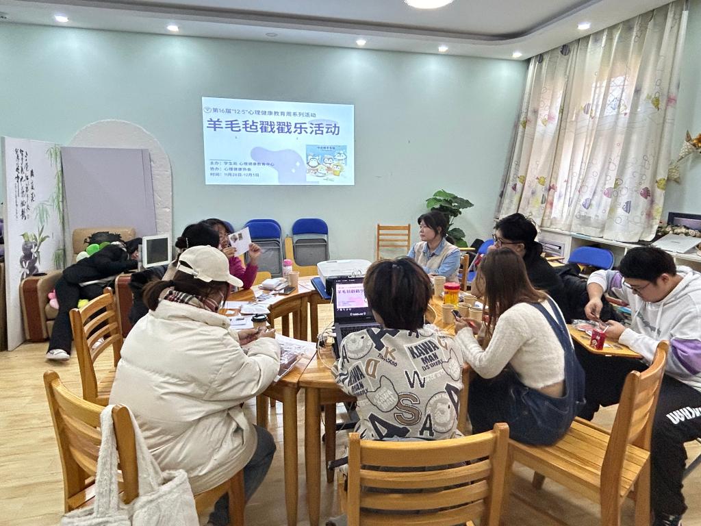 编织等手工活动对人体健康带来的有益效应与冥想类似,能引发大脑释放出“奖赏”激素—多巴胺,从而起到减压功效。为舒缓同学们的情绪压力,减少抑郁情绪,增强同学之间的互动,改善身心活动,提升幸福感,11月28日-29日,心理健康教育中心分批次举办了两场温暖羊毛毡,慧心“戳”快乐减压活动。