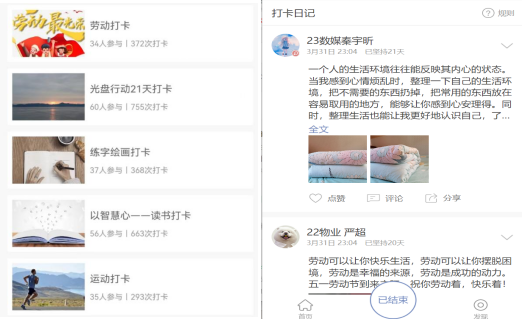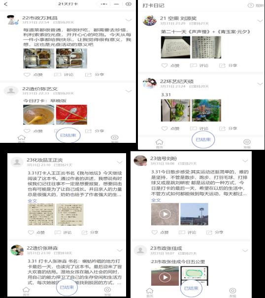 活动包括:同以体强心——运动打卡、以美润心——书画打卡、以智慧心——阅读打卡、以德育心——光盘打卡、以劳健心——劳动打卡。我院共计355人次参与打卡,其中25人坚持21天全程打卡,64.2%的同学坚持16天以上,累计打卡2451条。
