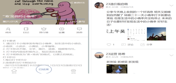 随着“#每日小确幸#”在微信小程序平台上发出,快乐和幸福便开始传递。打卡过程中,同学们以文字、视频、图片、语音等形式记录生活,互相分享喜悦与生活中的美好、共同度过了充满了小确幸的21天。打卡内容充分体现出了同学们在生活中感受幸福的能力,互相点赞与回复也在无意中拉近了彼此之间的距离。每一天的打卡既是一次记录,也是一次分享,同学们在很多事情中找到了共鸣。根据积分排名,共有11位同学获得院级证书及自选打卡图片的叶雕一副。
