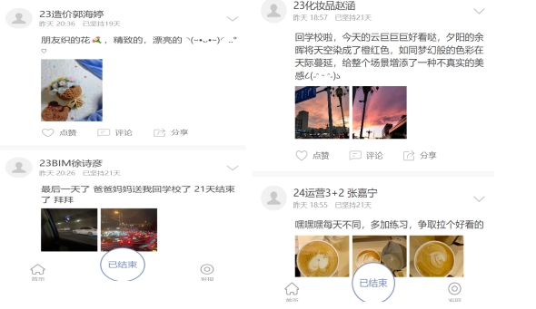 本次活动为参与者提供了记录与分享的平台,帮助大家停下脚步,关注生活的细微之处,发现身边的美好事物。“小确幸”不仅仅是生活中的点缀,更是治愈心灵的力量源泉,它们帮助我们在面对困难时保持乐观的态度,增强内心的韧性。愿这些鲜活而充实的记录会成为同学们珍贵的回忆,在未来的某个时刻重新温故时带给自己力量。在未来的日子里,希望同学们继续用心感受生活,将每一个“小确幸”编织成幸福的篇章,共同追寻并拥抱美好的未来!