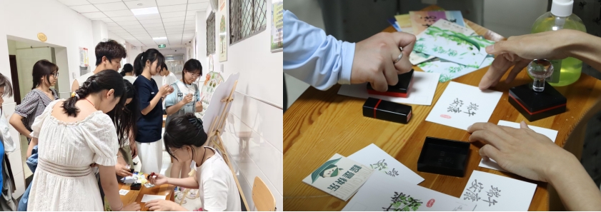 活动还未开始,102教室门口早已热闹非凡。小粽子展板成为大家尽情挥洒创意的画布。同学们手持画笔,或工整书写、或随性涂鸦,人形展板也成为火热拍照打卡点,更有精美的端午明信片更是备受青睐,大家拿着端午限定节日印章,印在明信片上,把对端午的美好期许都融入其中。