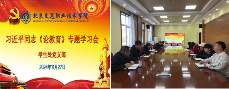 为全面贯彻党的教育方针,深刻认识并做好习近平总书记《论教育》学习宣传工作,与学习贯彻落实全国教育大会精神贯通起来,引导支部全体党员深切体会习近平总书记对教育工作的重视关怀和殷切期望,2024年11月27日上午,学生处党支部在办公楼一层会议室组织召开专题学习教育。