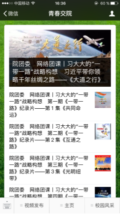 为引领当代大学生将学习生活与国家战略相结合,更好地融入“一带一路”伟大征程,5月24日我院团委开展第四期团课——《习大大的“一带一路”倡议构想》网络团课。本次团课通过团委“青春交院”微信平台发布《习近平带你领略千年丝绸之路——大道之行》微视频及《一带一路》视频纪录片。