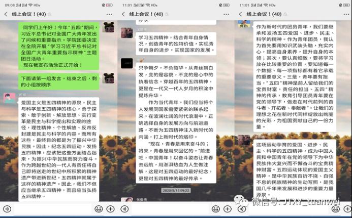 在此次团日活动中,各团支部在线上组织青年集体学习了习近平总书记五四前夕对青年的寄语,学习了习近平总书记给北京大学援鄂医疗队全体“90后”党员的回信,重温了习近平总书记在纪念五四运动100周年大会的讲话;有的团支部举办了支部专题团课,以团干部讲团课的方式组织团员青年开展学习;有的团支部组织召开座谈会,讲述青年在疫情防控的故事,畅谈自己的所做所思所想;围绕习近平总书记讲话精神,结合自身,谈了自己的感想和体会。