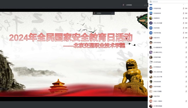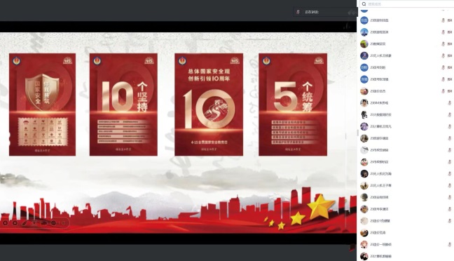 在线上集中学习过程中,由国旗班张琛昊同学带领学生学习习近平总书记关于总体国家安全观的重要论述,并向大家解读国家安全相关的知识及法律法规,使同学们深刻认识到战胜风险挑战、维护国家安全的重要意义,引导学生在今后的学习和生活中,不断增强忧患意识和使命担当。随后,组织参会人员参与国家安全知识竞赛,以赛促学,以知识竞赛为契机,不断增强学生的法治意识和国家安全意识。