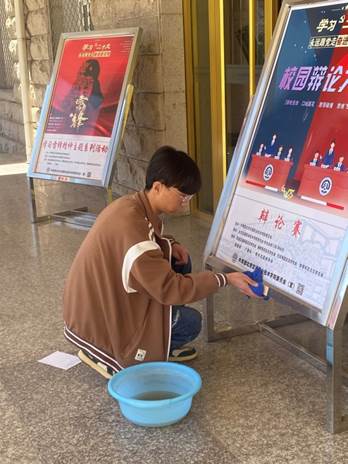为深入学习宣传贯彻党的二十大精神,引领我院广大青年传承和弘扬雷锋精神,丰富新时代青年志愿服务内涵,激励引导青年奋进新征程、建功新时代。3月,院团委组织开展学习雷锋精神主题系列活动,院团委宣传部主动响应号召,团结凝聚宣传部青年学子投身志愿服务,开展校园宣传展板清洁服务活动。