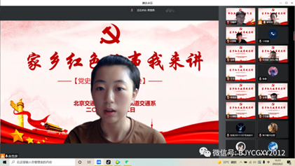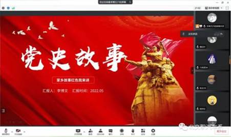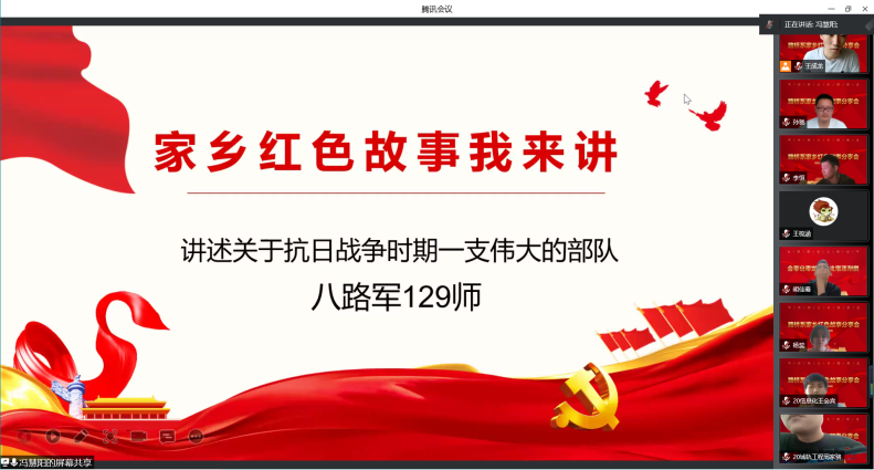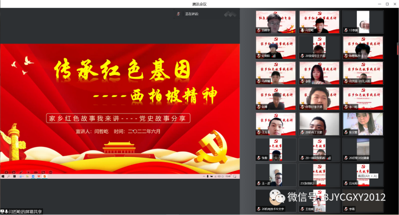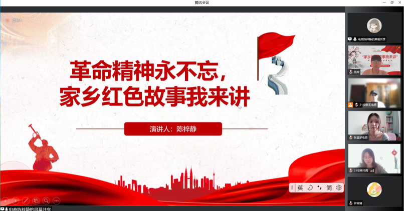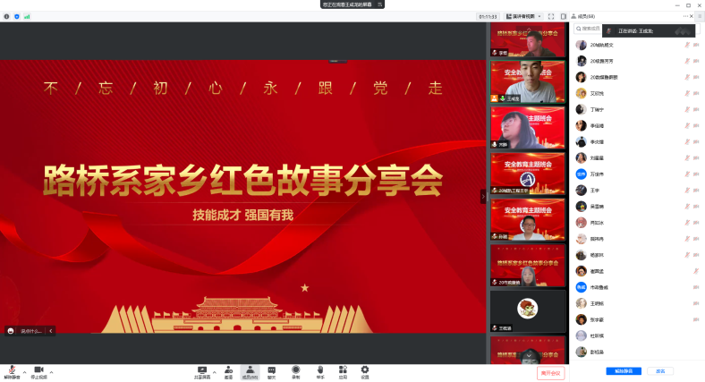 在各班会开展过程中,来自五湖四海的同学们纷纷讲述自己家乡的那段峥嵘岁月,用心感悟党的奋斗历程,一个个故事就像一幅幅动人的画卷展现在同学们面前,虽然此次活动采取线上开展,但是讲述人慷慨激昂的宣讲还是使同学们仿佛身临其境。学生们个个声情并茂、慷慨激昂地讲述了一个个既感人至深又催人奋进的家乡红色故事。感受到同学们在家乡红色故事的耳濡目染下长大。虽未曾与故事的主人公谋面,但大脑里却时常浮现出革命先辈伟岸的身影。故事中的英雄事迹值得同学们学习,故事中蕴含的革命精神值得我们传承和发扬,展现了一代代共产党人前赴后继,舍生忘死的奋斗精神和坚韧不拔、甘为人梯的奉献精神;有的讲述当地的英雄纪念碑的故事,抒发对革命前辈深深的敬意;有的用感人至深的讲述展示了家乡革命先烈不畏牺牲、坚守初心的坚定意志。充分展现了学生党史学习教育的所学、所感、所思、所悟。