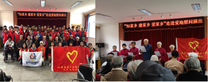 早上八点,迎着朝阳,志愿者们怀着激动地心情,带着精心准备了很多天的才艺表演,到达了爱地老人颐养中心,在负责人的安排下,同学们积极的投入了本次慰问演出的准备活动中,在场地内精心布置认真排练,活动在九点半正式开始了。