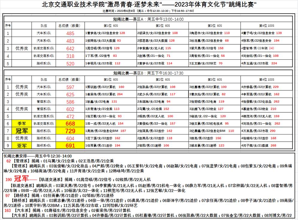此次跳绳比赛分为团体长绳比赛和四人接力短绳比赛,赛前,团委颜老师宣布了比赛规则,并将参赛选手分为不同组别进行比赛。各参赛选手陆续开始热身,互相加油打气。随着比赛的进行,气氛逐渐火热起来,每位同学都摩拳擦掌,蓄势待发。长绳比赛中同学们跟随绳子落地的节奏依次从绳子上跃过,充分展现了彼此强有力的默契。与此同时,周围同学的呐喊声、加油声一层盖过一层,将比赛的氛围推向高潮。短绳接力比赛中,赛参选手矫健的身姿、不间断的跳跃,都使得观赛的同学沉浸于这紧张的气氛中,每位参赛成员都赛出了高度、赛出了风采,完美诠释了运动与快乐的理念,为校园增添了一抹亮丽的色彩。最终,轨道交通系代表队荣获长绳比赛冠军。路桥系2号代表队、4号代表队荣获短绳比赛冠亚军、轨道交通系2号代表队荣获短绳比赛季军。