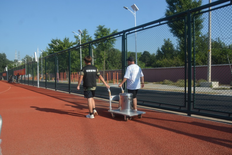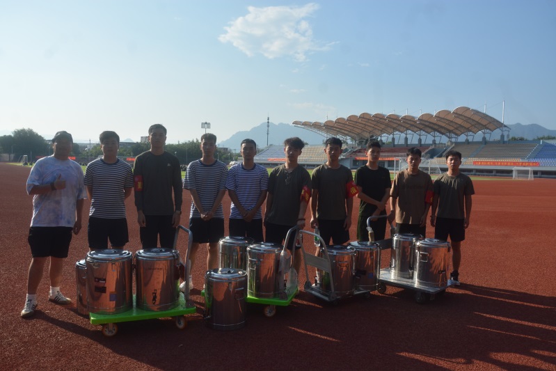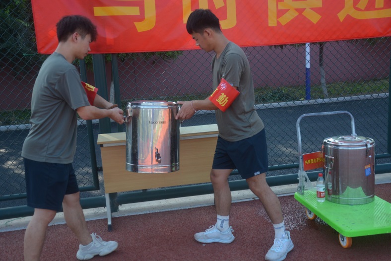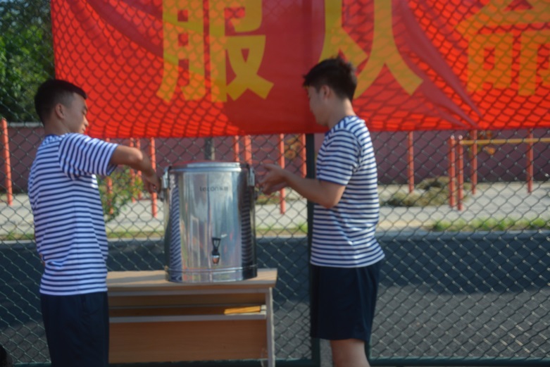 天气炎热,训练辛苦,为使同学们在训练场直接喝到健康的热开水,我院学生处在训练场设立了十处饮用水服务点,每天供应热开水,为同学们和教官能够及时补充水分满足身体所需。每天早晨,在团委颜金海老师的组织下,退役军人志愿者们就准时将十桶热开水运送至训练场摆放整齐有序,每下午训练前,再将空桶取走补水接满再送回训练场。在学院团委颜金海老师和志愿者们共同努力下,每天在各点巡视,确保军训期间热水满桶,平均每天供水量10余桶。
