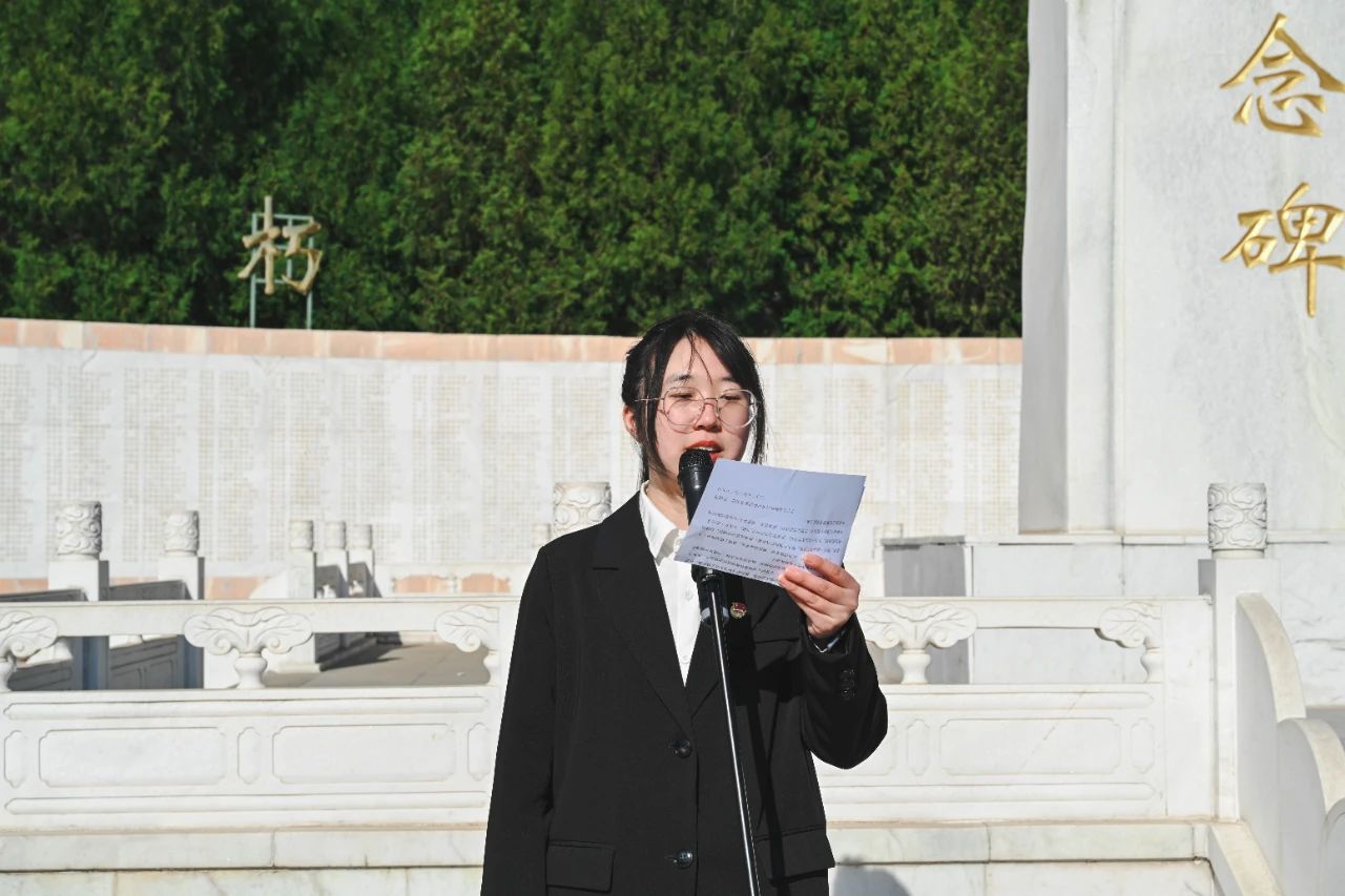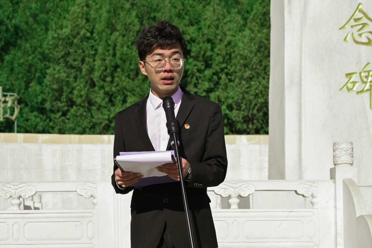 祭奠仪式现场庄严肃穆,全体师生身着黑色正装,怀着崇敬的心情,整齐列队于烈士纪念碑前。在雄壮的国歌声中,仪式正式开始。国旗班代表和团支书代表先后发表讲话,表达对革命先烈的深切缅怀与崇高敬意。