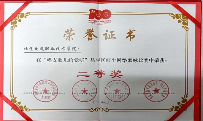 百年风雨兼程,百年岁月如歌。红歌精神催人奋进,激励斗志。为了激发学生的爱党爱国热情,引领学生树立远大志向,增强实现中华民族伟大复兴的使命感和责任感,增强集体凝聚力,我院参加了“唱支歌儿给党听”昌平区师生网络歌咏比赛。以“唱响红歌颂党恩,不忘初心跟党走”为主题,由院长带领学院领导班子,组织教师代表、学生代表等近150余名师生通过独唱、合唱的方式,在学院标志性建筑、教室、实训室等场地唱响红色歌曲,并喜获二等奖。