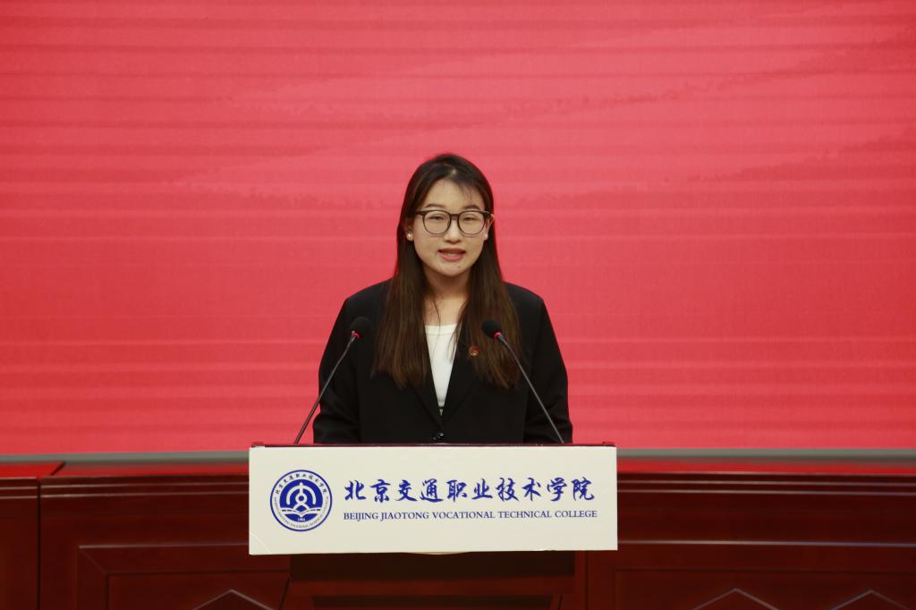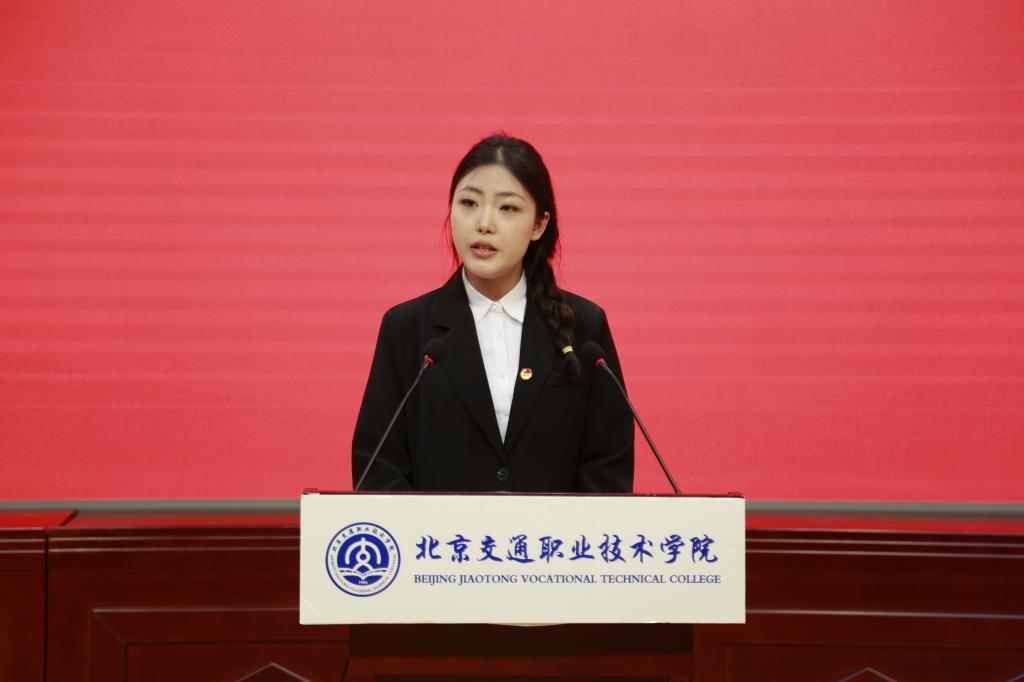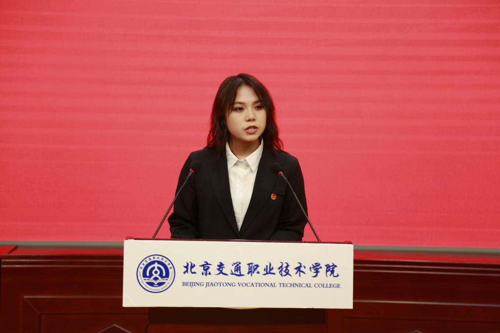 北京市级先进班集体代表宗梓圆同学在发言中提到在班级建设中要保持团结、进取、创新的班级精神,不断追求卓越、勇攀高峰,展现当代大学生的青春风采和精神风貌,争做“有理想、有道德、有文化、有纪律”的四有青年。