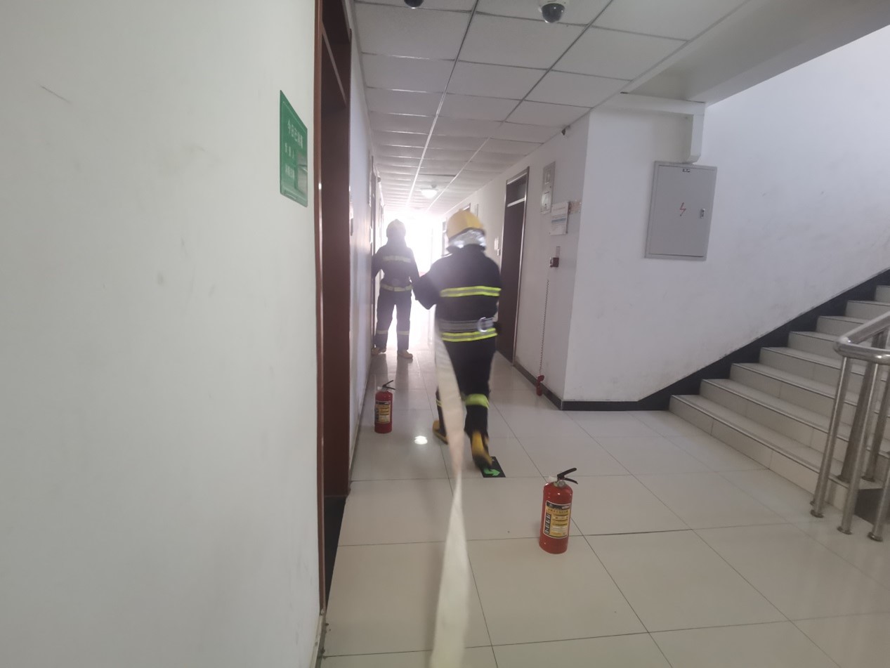 当日12时,宿管科工作人员发现在宿舍楼二楼发生火情,中控室立即响应,并在总指挥指示下启动火灾疏散逃生演练。宿管科工作人员首先在宿舍楼内通过消防广播进行通知预警并迅速上楼进行排查,确认是二层楼道出现火情,即刻拿取就近的灭火器、消火栓进行灭火;疏散组的工作人员则有序组织学生按照逃生通道进行疏散;微站队员上楼进行滞留人员情况排查;警戒组做好楼门警戒;医疗救护组、影像采集组密切配合。截至12:10,火情被完全控制;12:15,全部学生被疏散到室外安全空旷地带。警情完全解除,演练顺利结束。一切工作有条不紊地进行。