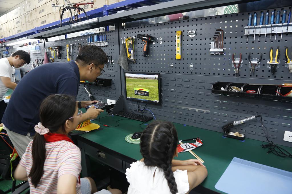 随后,老师带领学生们体验了飞机模型的组装、调试和飞行,并分小组进行比赛。最后的实操环节将活动推向高潮。孩子们分组操控迷你无人机,完成起飞、悬停、绕障等基础操作,活动现场气氛热烈,欢呼不断。