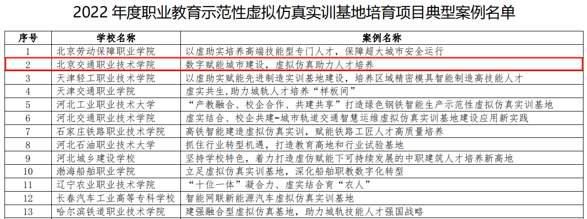 11月9日,教育部高等学校科学研究发展中心公布《2022年度职业教育示范性虚拟仿真实训基地典型案例名单》,学院“数字赋能城市建设,虚拟仿真助力人才培养”入选。此次教育部评选的典型案例项目全国共有68所职高等职业院校入围,北京仅有2所高等职业院校入选,我院是其中之一,这是学院第一次入选国家级职业教育示范性实训基地建设典型案例。