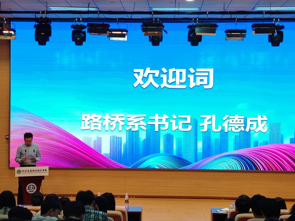 路桥系党支部书记孔德成致辞,他强调,“弘德立行技青春"是新时代职业教育对大学生成长的深刻注解,是路桥系秉承"至艺立人"校训精神,致力于培养具有扎实技能、创新精神和社会担当的交通建设人才的具体实践。此次活动的举办,既是一场职业技能的竞技场,也是一次锤炼品德的必修课,更是一个展示青春的大舞台。同时,孔书记也对同学们寄予厚望,希望同学们此次活动为契机,弘扬工匠精神,涵养职业品德,用技能点亮青春。