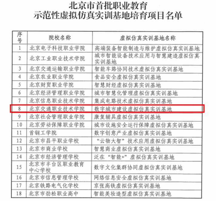 2022425日,北京市教育委员会公布了北京市首批职业教育示范性虚拟仿真实训基地培育项目名单,beat365在线唯一官网登录“数字城市建设虚拟仿真实训基地”名列其中。