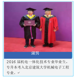 2016届机电一体化技术专业毕业生,专升本考入北京建筑大学机械电子工程专业。