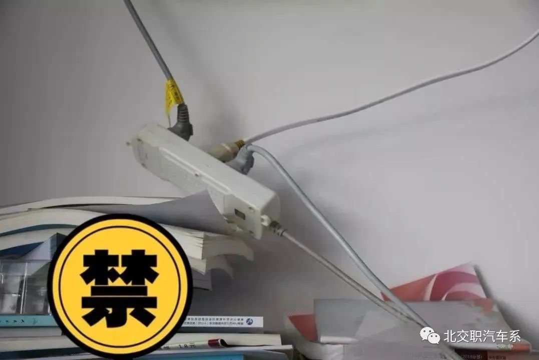 私接电源:由于生活条件的改善,同学宿舍内的电子产品非常普及。同学们为了使用方便,宿舍内私拉电线,乱接插座,更有甚者直接将电线接到床上。电线没有被固定,反而经常被拖来拽去,造成接头松动,极易造成线路短路或因接触不良发热而起火。