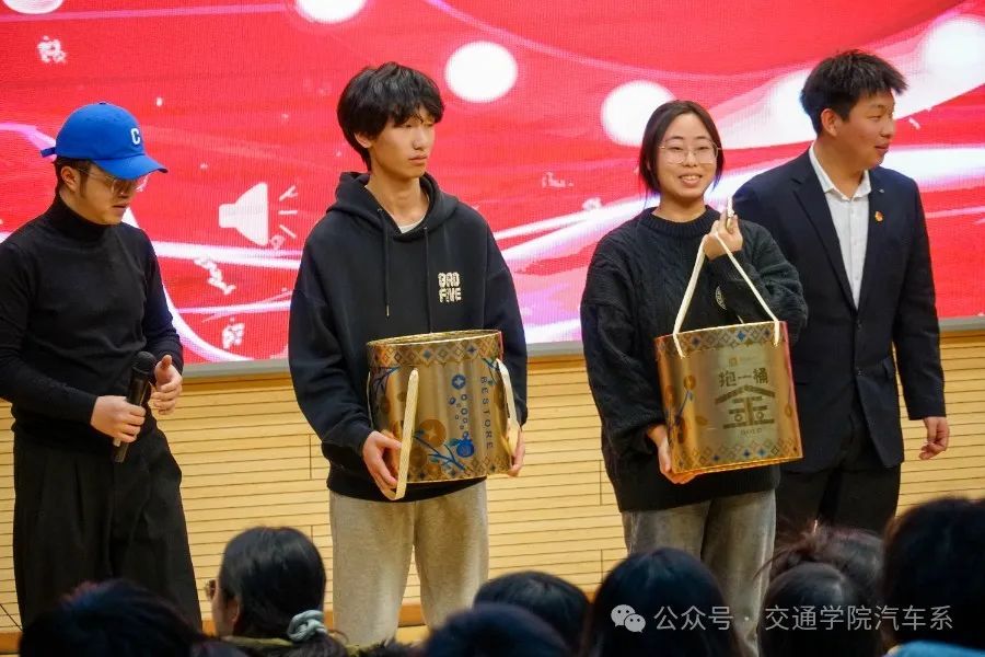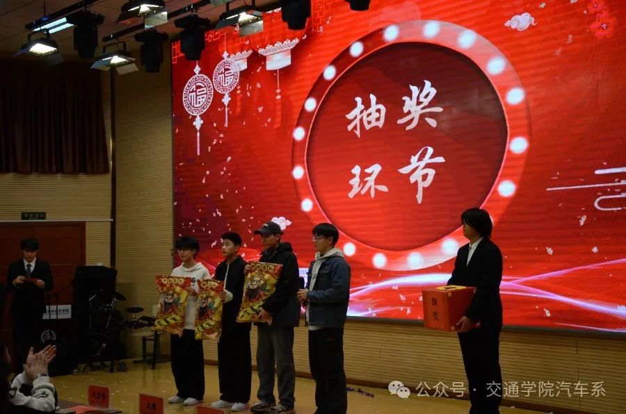 本次晚会共有三次抽奖环节,大家在进场前领号码,由指定老师在抽奖箱内随机抽取号码,选出一、二、三等奖的幸运者,被抽中的幸运者可以得到由汽车系精心准备的零食礼包、饮料等奖品。