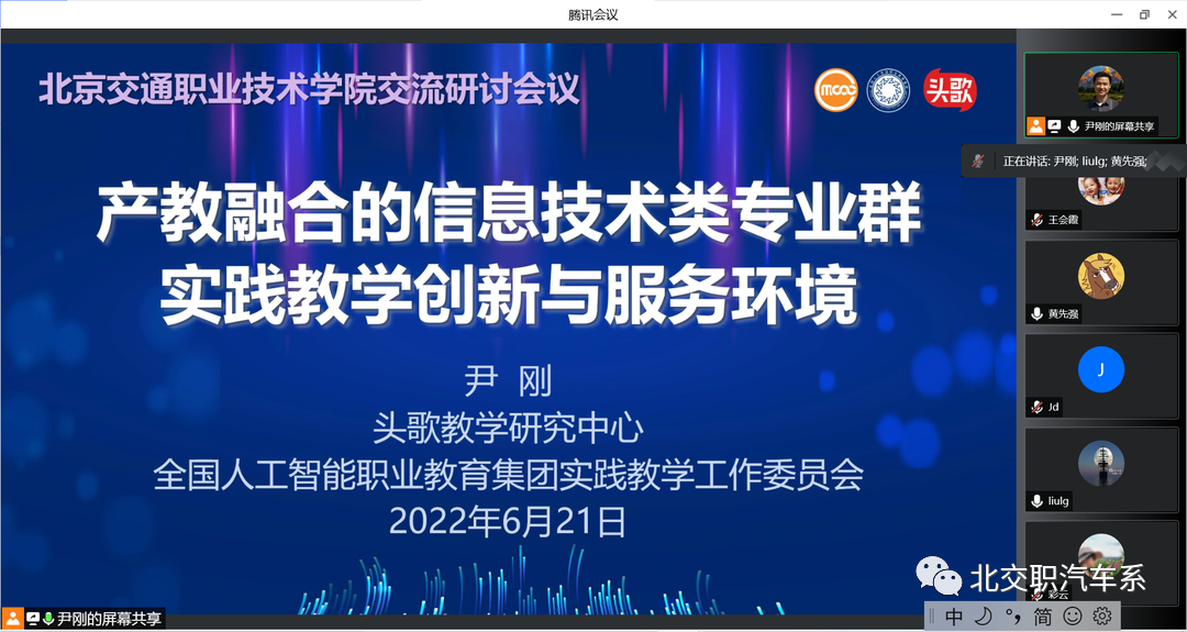为进一步优化计算机相关课程教学改革,提高在线教学质量,2022年6月21日上午,计算机专业群协同头歌教学研究中心开展线上教学研讨会,参会人员有我系主任刘连光,计算机教研室主任姜丹,计算机专业教师蔡芸、王会霞,头歌教研室尹刚主任、头歌产教融合北京区负责人黄先强。