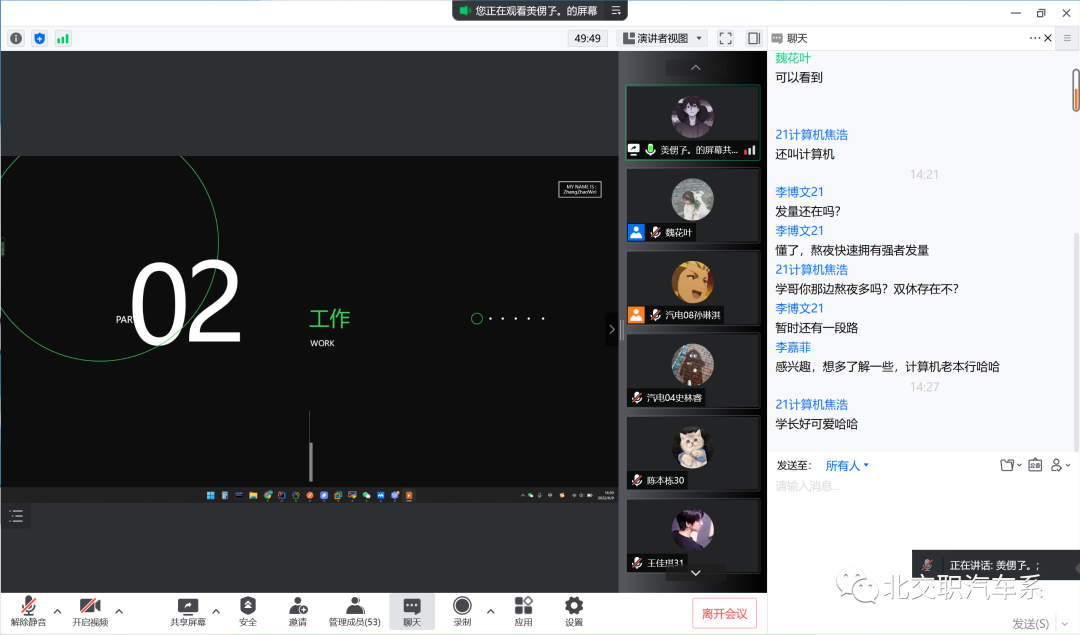 为教育引导学生将具备优良品德的大国工匠、能工巧匠、劳动模范、行业能手、创业之星等作为学习、追赶和立志超越的成才榜样。六月九号我们特邀16级汽车系计算机应用技术专业的优秀毕业生张钊玮学长以线上会议的形式来为我们汽车系全体学生进行了一次极具意义的“寻访职业榜样”主题学习教育座谈会。