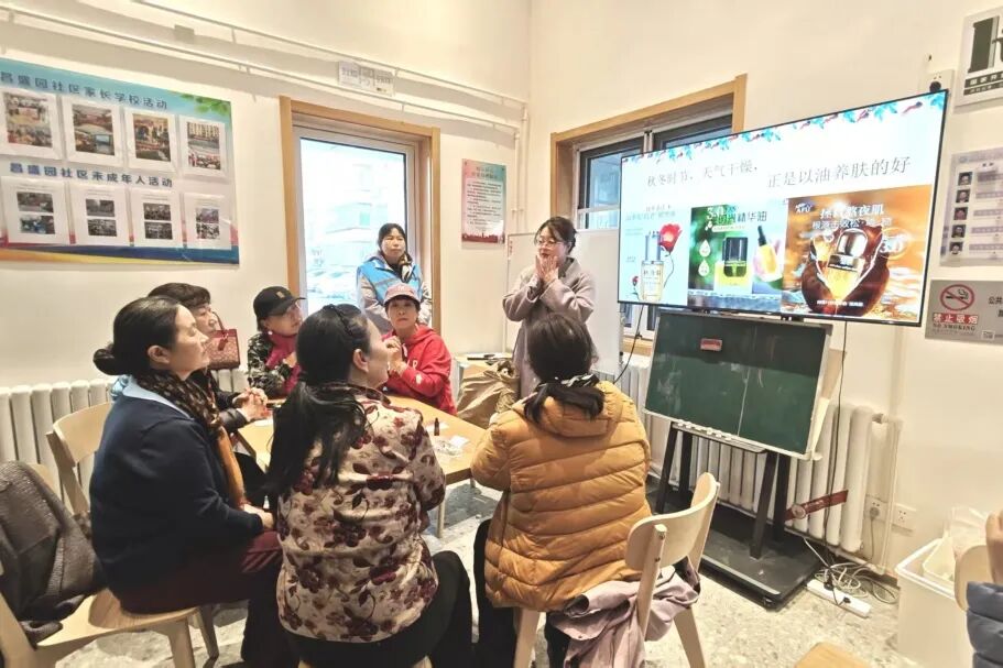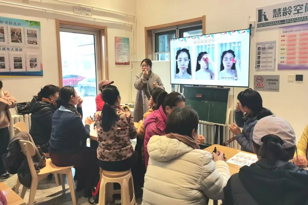 学院管理系化妆品经营与管理专业高润副教授为居民们详细讲解了精油的种类、功效、用途及精油制作的基本步骤和注意事项,并指导大家亲手制作专属护肤精油。居民们兴致勃勃地挑选基础油和香薰精油,按照个人喜好调配出独一无二的配方。活动现场,气氛热烈,居民们热情参与,纷纷动手制作适合自己的专属护肤精油。