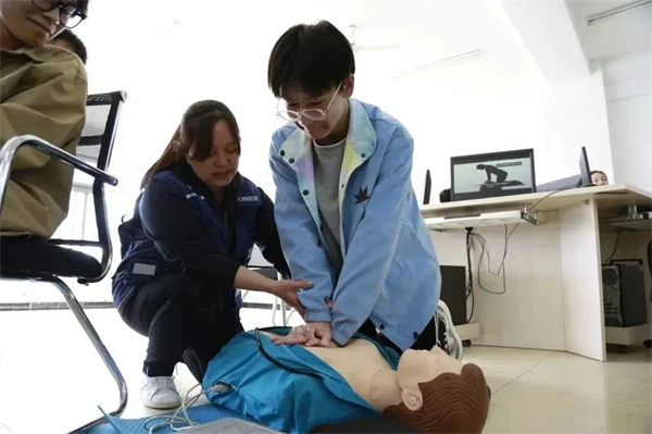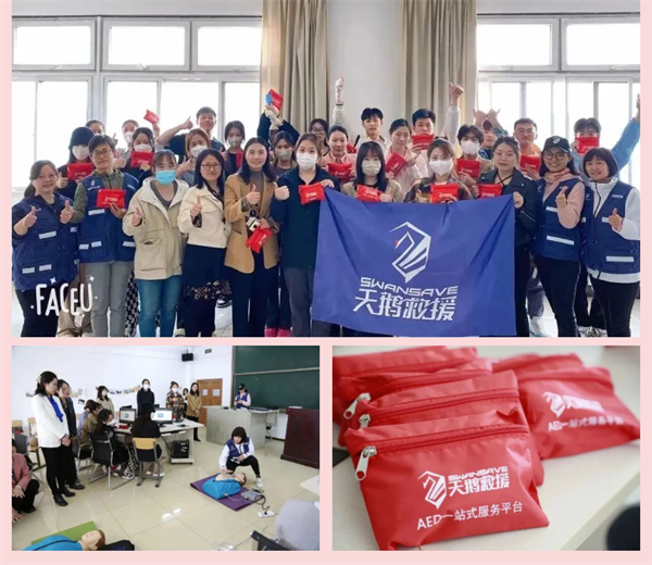 本次培训共计3小时,内容主要包括心肺复苏(CPR)、自动体外除颤器(AED)使用及各种包扎方法训练,采用理论和实践相结合的方式,导师先讲解操作方法及要点,学生和老师分组练习。培训现场配备三套具有反馈功能的模拟人和训练用AED;每人一个急救包,内含:酒精消毒棉片2片、一次性口罩1只、纱布辅料1包、绷带1卷、一次性CPR呼吸面膜1片、一次性单向阀1只,三角巾一块。师生均有练习机会,实操过程中有专门的导师对动作进行指导,保证了培训效果,让师生真正掌握救命技能。