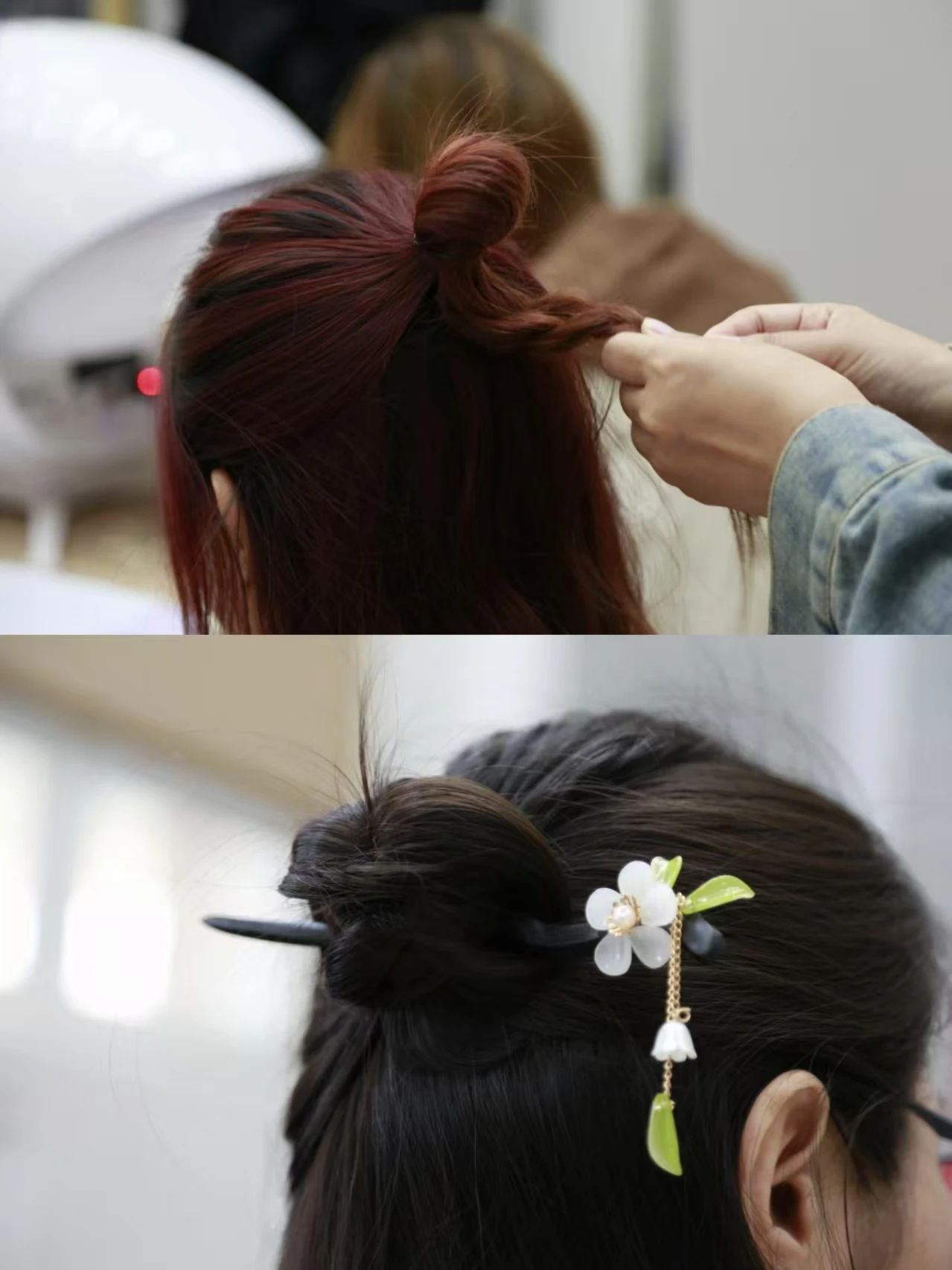 中式盘发体验区则是古典美学的天地。造型师展示多款中式盘发样式,从典雅的发髻到灵动的发辫,尽显东方韵味。参与者挑选心仪样式后,造型师一边盘发,一边讲解其中的文化内涵与技巧。
