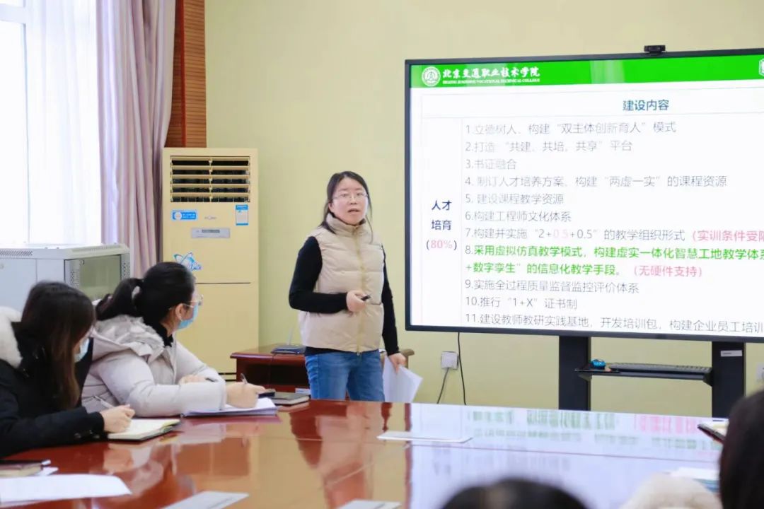路桥系教师赵久敏对数字城市建设虚拟仿真实训基地的建设作阶段性汇报。该基地是北京市首批职业教育示范性虚拟仿真实训基地,入选教育部2022年度职业教育示范性虚拟仿真实训基地典型案例。